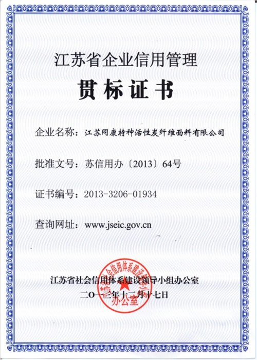 近日,同康公司通過江蘇省社會信用體系建設領導小組辦公室嚴格的審核評定,榮獲“江蘇省企業信用管理貫標企業”榮譽。